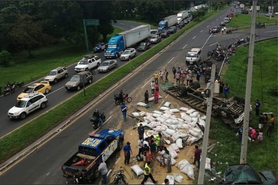 Luego que un accidente múltiple se registrara en la autopista Palín-Escuintla, varios costales que eran transportados por un trailer quedaron sobre el pavimento y las personas trataron de hurtarlos.