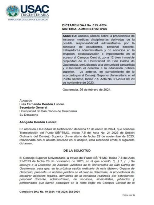 El dictamen indica instaurar medidas disciplinarias por la conducta de las personas que "obstaculizaron e impidieron" el acceso al Campus Central de la universidad, en la zona 12 capitalina.