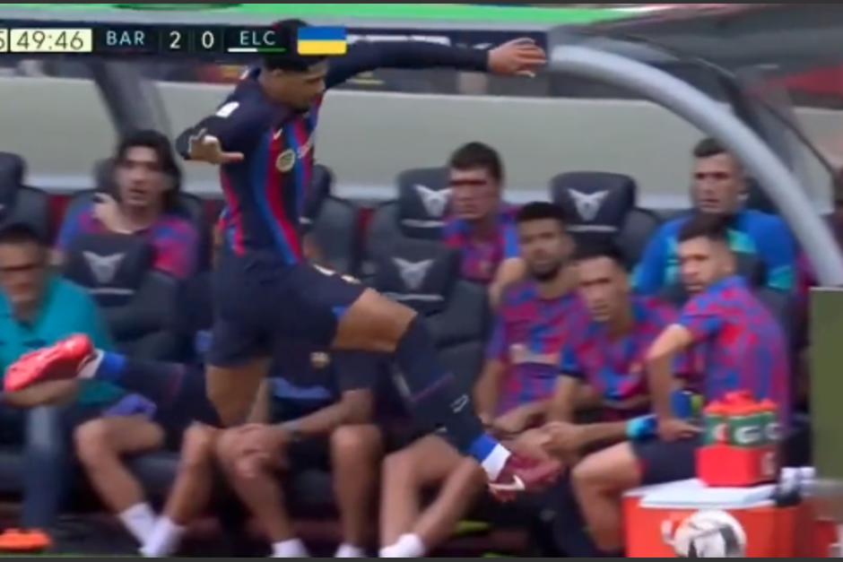 Durante el encuentro del Barcelona contra el Elche, el central uruguayo, Ronald Araujo en el intento de salvar un balón en la banda y estuvo a punto de pisar el escudo del Barça sobre el césped, pero saltó para no hacerlo.