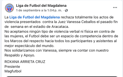 La Liga de Fútbol del Magdalena se pronunció condenando categóricamente la agresión física contra Vanessa Ceballos.