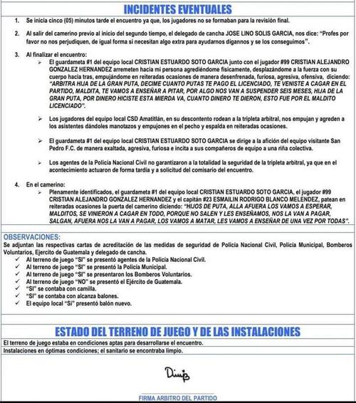 De acuerdo con el reporte de incidentes, cuando el encuentro futbolístico terminó, los jugadores Cristian Alejandro González Hernández y Cristian Estuardo Soto García, del CSD Amatitlán, agredieron físicamente a la árbitra y la empujaron hacia atrás, en reiteradas ocasiones.