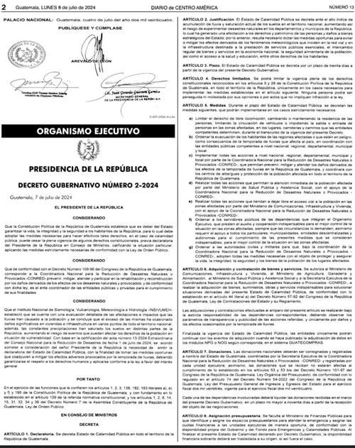 El Gobierno de Guatemala publicó este lunes 8 de julio, a través del Diario de Centro América (DCA), el Acuerdo Gubernativo número 2-2024 con el que se decretó estado de Calamidad Pública en todo el territorio nacional.
