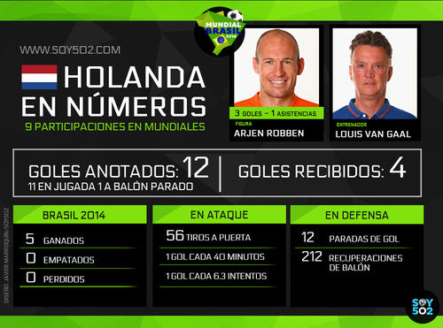 Con una ofensiva temible compuesta por Wesley Sneijder, Arjen Robben y Robin Van Persie, el equipo que conduce Louis van Gaal quiere convertirse en el primer equipo europeo en consagrarse en tierra americana.