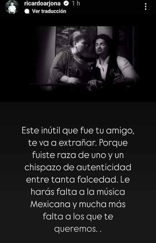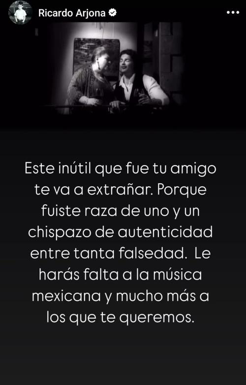 "Este inútil que fue tu amigo, te va a extrañar. Porque fuiste raza de uno y un chispazo de autenticidad entre tanta falsedad", inicia el mensaje que compartió Ricardo Arjona.