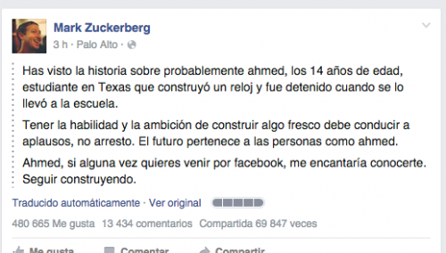 También Marck Zuckerberg , creador de Facebook se pronunció ante lo ocurrido e invitó a visitarlo para conocerse.