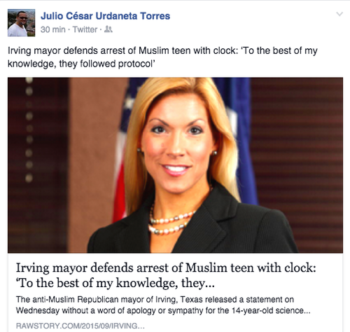 Por llevar a la escuela MacArthur High School un reloj que el mismo había construido, fue arrestado en Estados Unidos un niño de 14 años llamado Ahmed Mohamed, cuyo padre es un migrante sudanés y son musulmanes . El hecho ocurrió en el condado de Irving en Dallas, Texas. La profesora de inglés confundió el artefacto con un dispositivo explosivo, luego de que este emitiera sonidos cuando el reloj activó su alarma.