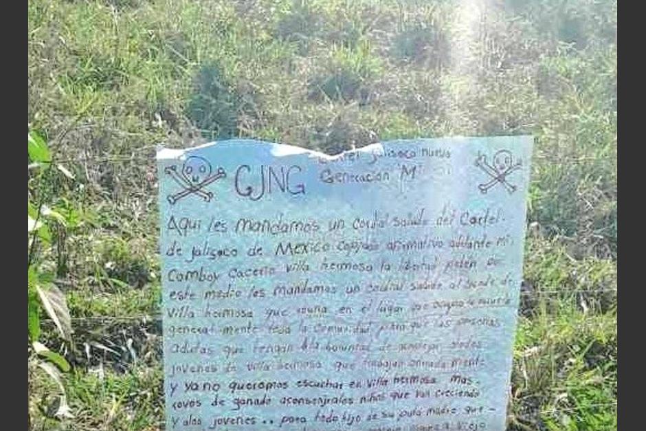 El mensaje fue firmado por el peligroso Cártel Jalisco Nueva Generación (CJNG) de México, y dirigido a otro grupo vinculado con el narcotráfico en Guatemala.