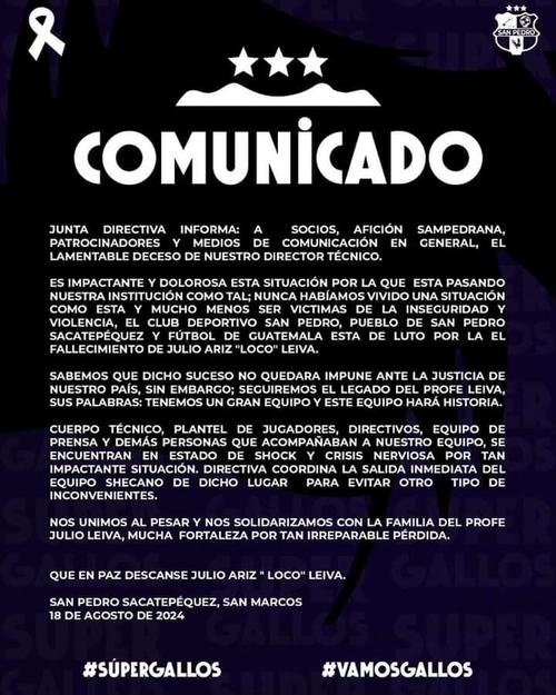 "Mucho menos ser víctimas de la inseguridad y violencia; el Club Deportivo SanPedro, pueblo de San Pedro Sacatepéquez y fútbol de Guatemala está de luto por el fallecimiento de Julio Ariz "Loco" Leiva", puntualizaron.