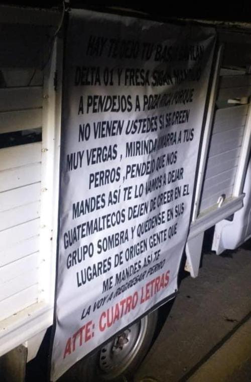 En otro se indica: "Mirinda amarra tus perros (...) que nos mandes así te lo vamos a dejar. Guatemaltecos dejen de creer en el Grupo Sombra y quédense en sus lugares de origen, gente que mandes así te la voy a regresar perro. Atte. Cuatro Letras".
