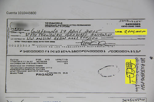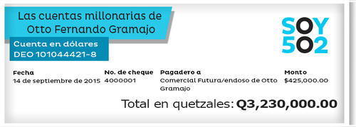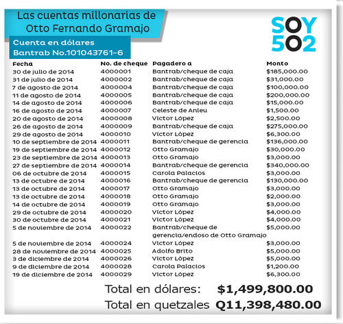 Soy502 tuvo acceso a copias de 56 cheques provenientes de cuatro cuentas bancarias a nombre de Gramajo Antonio o donde él tiene firma. En estas cuentas bancarias se evidencia que el aviador giró cheques por 45 millones 671 mil 782 quetzales, entre el 30 de julio de 2014 y el 14 de septiembre de 2015.