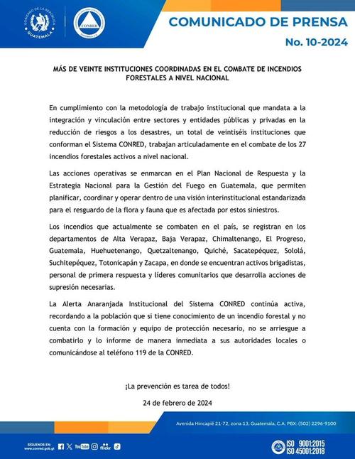 En su más reciente boletín informativo, la Coordinadora Nacional para la Reducción de Desastres (Conred) dio a conocer que se mantiene la alerta naranja institucional, como parte del protocolo para atender el incendio del volcán de Agua y otros 26 que están activos en el país.