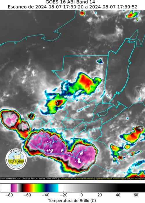 La lluvia en el área es el principal factor que incide en el avance de los trabajos. Esta es la imagen del Instituto Nacional de Sismología, Vulcanología, Meteorología e Hidrología que refleja la situación ayer por la tarde: