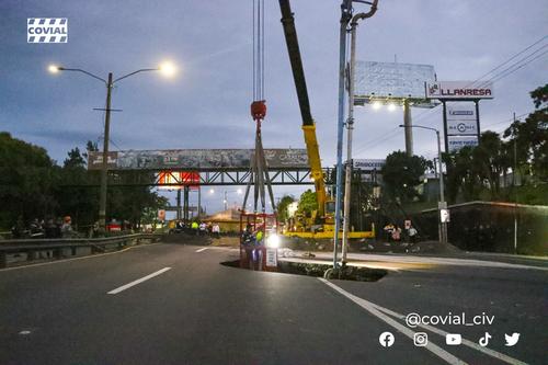Las autoridades del Ministerio de Comunicaciones continúan el relleno de la caverna que se formó en la ruta al Pacífico esta semana. Se espera que en las próximas horas, el cemento alcance el nivel de la carretera para aplicar el asfalto.