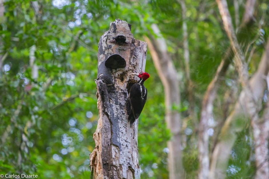 El fotógrafo Carlos Duarte estuvo trabajando recientemente en las cercanías del biotopo Dos Lagunas y Naachtún, donde pudo ser testigo cómo un pájaro carpintero laboraba arduamente en un árbol.