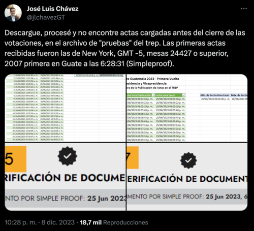 Jose Luis Chávez del Cid utilizó su plataforma de X para explicar que él mismo descargó y procesó las mismas actas del TREP, de la misma forma que el MP habría hecho, solo que en esta ocasión, menciona que no encontró ningún acta cargada antes del cierre de votaciones.