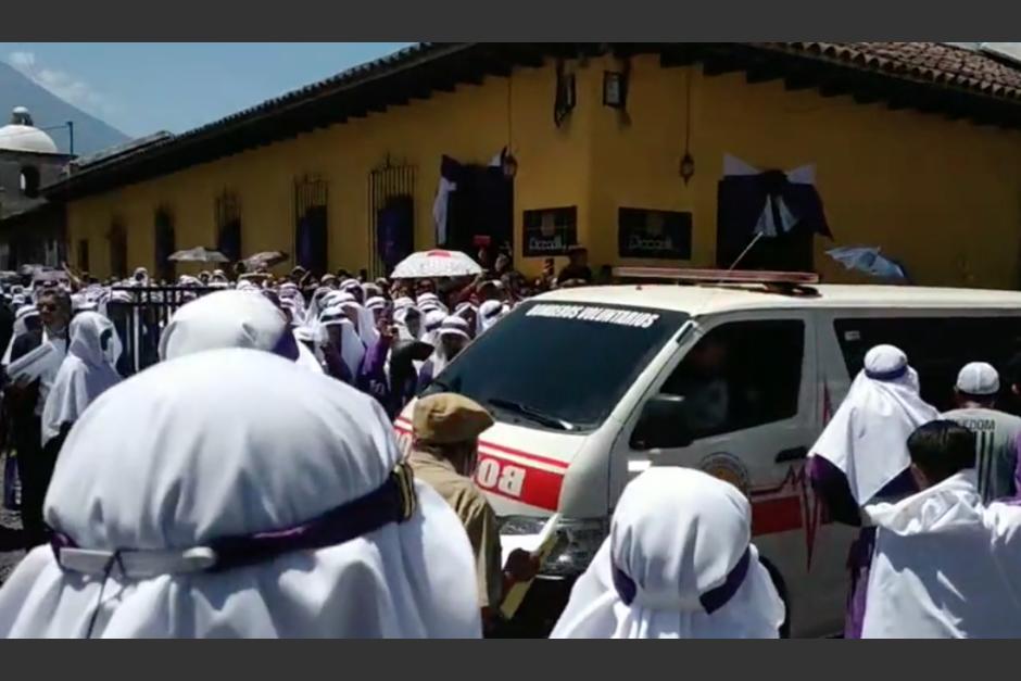 El recién pasado Domingo de Ramos fue captado en video, el momento en el que decenas de cucuruchos se detienen para que pueda pasar una ambulancia de los Bomberos Voluntarios.