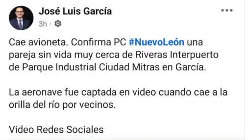En su publicación, escribió: "Cae avioneta. Confirma PC Nuevo León una pareja sin vida muy cerca de Riveras Interpuerto de Parque Industrial Ciudad Mitras en García. La aeronave fue captada en video cuando cae a la orilla del río por vecinos".
