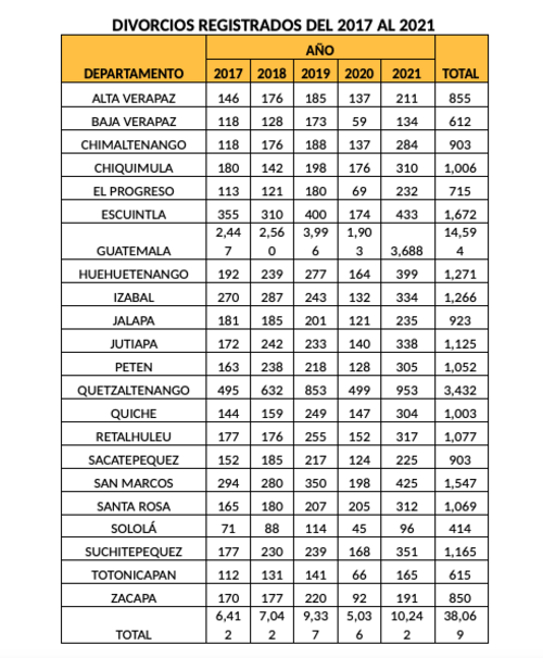 El Registro Nacional de las Personas (Renap) reporta que durante el 2020 se registraron 5,036 divorcios a nivel nacional. En 2021 se registraron 10,242 divorcios. El Renap revela que en el departamento de Guatemala se llevaron a cabo 1,903 divorcios en 2020 y 3,688 en 2021. Quetzaltenango quedó en un segundo lugar con 499 divorcios en 2020 y 953 divorcios en 2021.