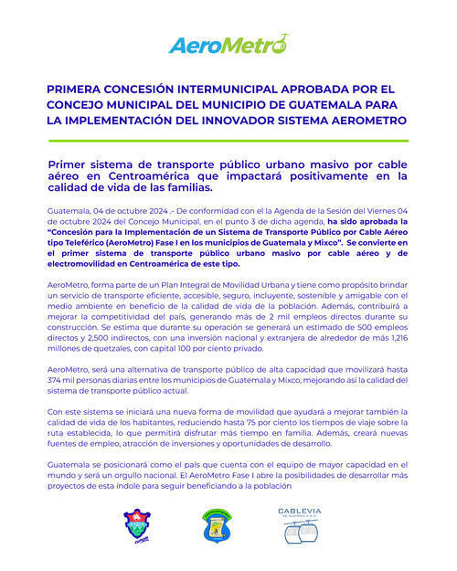 A principios de octubre pasado, la Municipalidad de Guatemala en conjunto con la Municipalidad de Mixco y la empresa CableVía llevaron a cabo la aprobación de la primera concesión para la implementación del Aerometro.