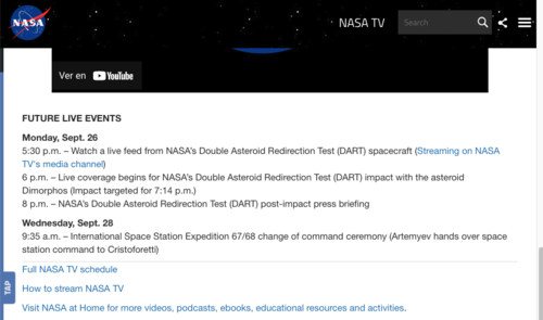 Luego, debes buscar el enlace del evento "Watch a live feed from NASA's Double Asteroid Redirection Test (DART)".