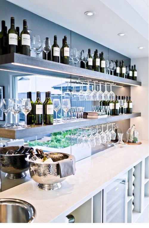 2. ¿Tienes algún hueco entre una pared y una columna? En este pequeño espacio muerto utilízalo para crear uno. Añade una estantería y un mueble inferior o carrito para poner las botellas.
