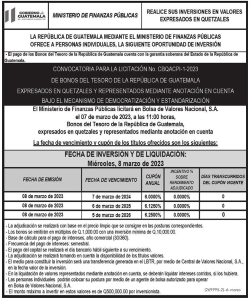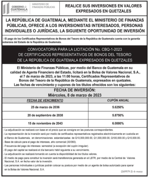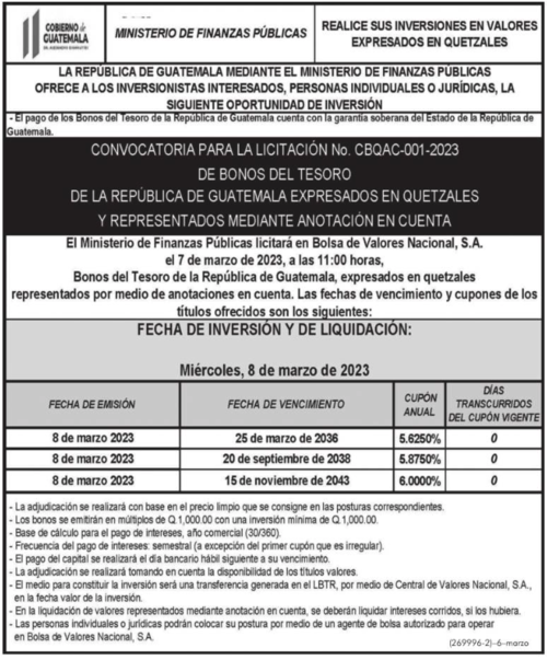 Cabe destacar que estos anuncios de colocación de Bonos del Tesoro fueron publicados en la sección Legal del Diario de Centro América. La tercer convocatoria de licitación es la siguiente: No.CBQAC-001-2023, la cual tendrá tres fechas de vencimiento. En esta oportunidad, la diferencia radica en que el monto mínimo para invertir es de Q1 mil.