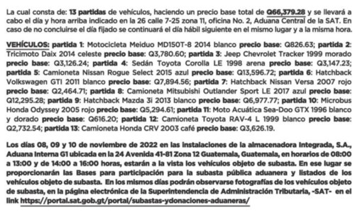 El próximo 11 de noviembre, la Superintendencia de Administración Tributaria (SAT) subastará automóviles. Algunos de los automotores son de modelo reciente y tienen precios iniciales desde Q2,400.