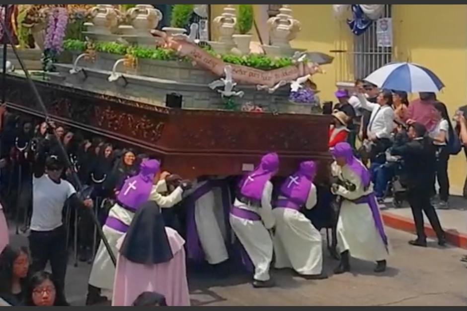 Según se evidenció, todo ocurrió en la procesión que salió del Templo la Recolección en la zona 1, y el anda de estuvo a punto de caer, debido a que las cargadoras no soportaban el peso.