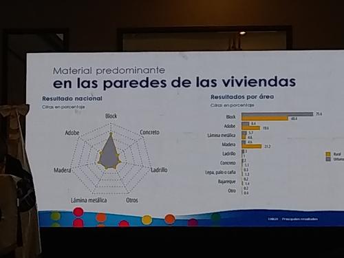 Los resultados presentados por Brenda Miranda, gerente del INE, revelaron que la mayoría de guatemaltecos viven en casas con paredes de block, el 75% de los que viven en zonas urbanas y el 49% los que viven en zonas rurales. Además en las zonas rurales el 21% usa paredes de madera y el 19% de adobe.