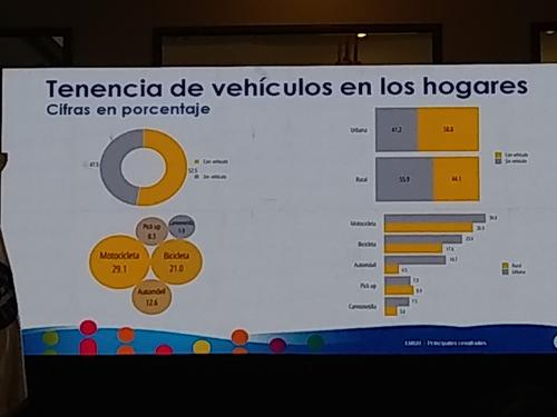 Por otro lado, la encuesta evidencio que el 52% de los hogares cuentan con al menos un vehículo, el 58% en las ciudades y el 44% en las zonas rurales. La motocicleta es el vehículo dominante a nivel nacional ya que el 29% posee este medio de transporte, mientras que el 21% usa la bicicleta, el12% tienen automóvil, el 8% pick up y el 5.9% camionetilla.