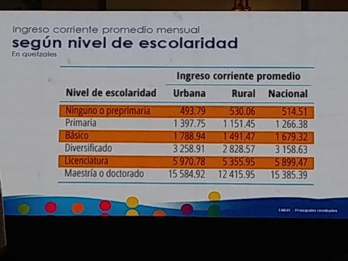 La región I que abarca el área metropolitana es donde los habitantes logran mejores ingresos y resalta que las personas con un nivel académico de maestrías y doctorados ostentan salarios de Q 15 mil aproximadamente, contra casi Q 6 mil para quienes poseen una licenciatura.
