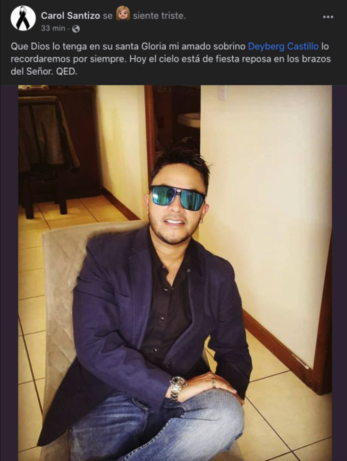 "Que Dios lo tenga en su santa Gloria mi amado sobrino Deyberg Castillo. Lo recordaremos por siempre. Hoy el cielo está de fiesta. Reposa en los brazos del Señor. QED", escribió Santizo en su mensaje.