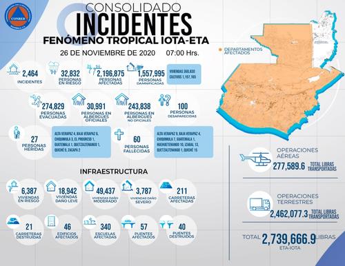 La Coordinadora Nacional para la Reducción de Desastres (Conred) dio a conocer que aún hay 100 personas desaparecidas tras el paso de los fenómenos naturales Iota y Eta.