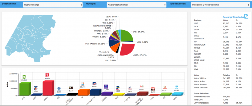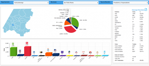 La página del Tribunal Supremo Electoral (TSE) reporta la mañana de este martes que aún no se ha finalizado con el conteo de votos en todo el país. Hasta el momento solo el 98.39 por ciento de las Juntas Receptoras de Votos han sido escrutinadas, equivalentes a 319 mesas faltantes.
