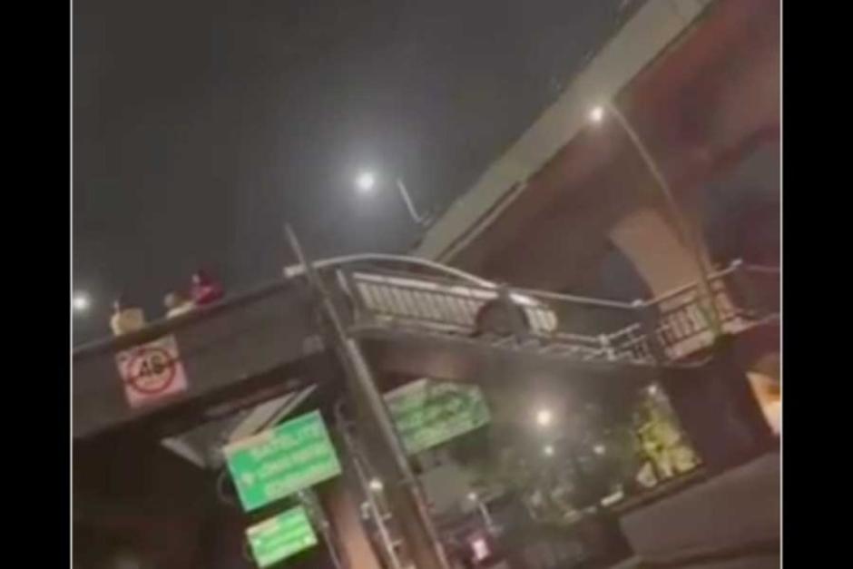 Se puede visualizar en el video que el carro blanco queda atorado en las escaleras, mientras varias personas se encuentran arriba del puente peatonal.