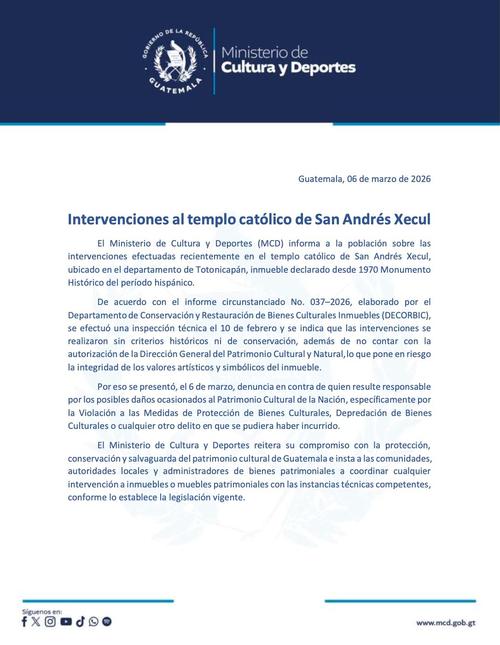Ante este hecho, el Ministerio de Cultura y Deportes se pronunció por medio de un comunicado el 6 de marzo, advirtiendo que se presentó una denuncia en contra de quien resulte responsable por este hecho, ya que se está dañando el patrimonio cultural.