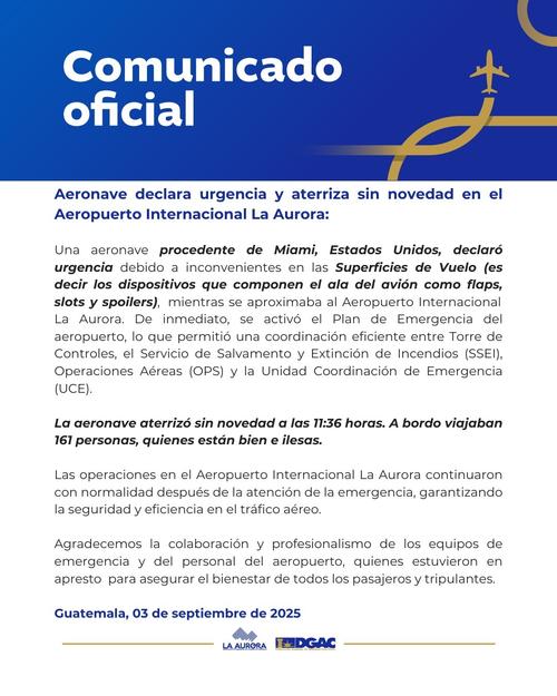 Luego del incidente, ocurrido durante la mañana de este miércoles 3 de septiembre, las actividades en el Aeropuerto Internacional La Aurora, continuaron con normalidad.