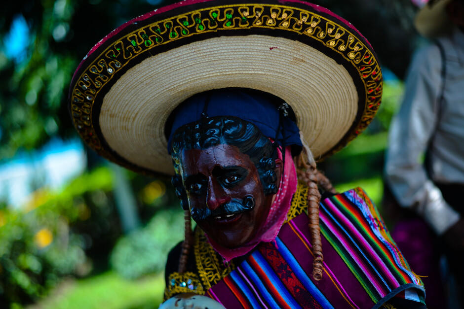 Portando trajes y sombreros de charros, máscaras talladas en madera, maracas y acompañados de las notas de la marimba, quienes participan en El Mexicano deleitan a vecinos en la feria patronal en honor a Santiago Apóstol.