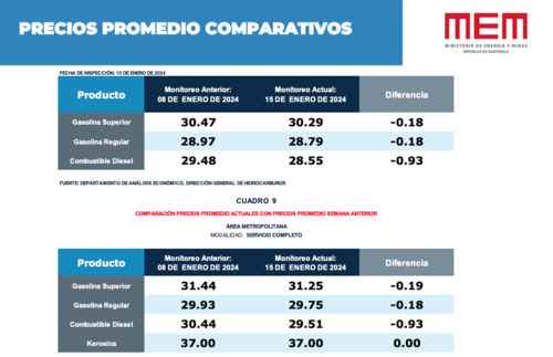 En el reporte del MEM también se observa la variación de precios del combustible regular que, figura como uno de los productos con más alto consumo, este refleja una reducción de 18 centavos, siempre en la modalidad de servicio completo.