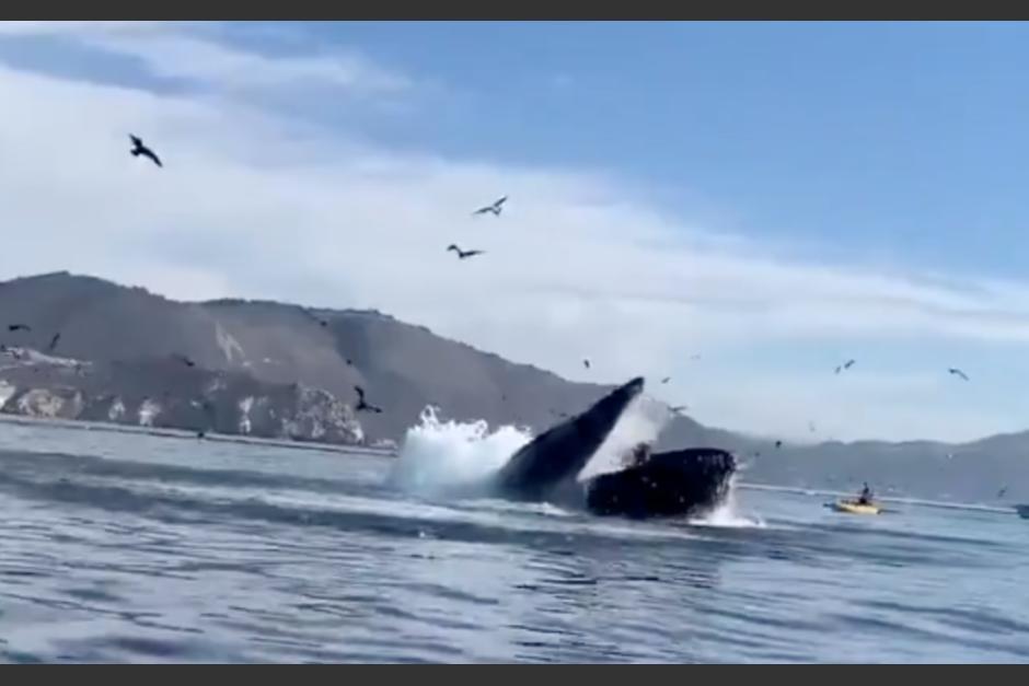 En redes sociales circula un video que muestra el momento exacto en el que una ballena jorobada que cazaba un banco de peces, se "traga" a dos mujeres que disfrutaban de un viaje en kayak.
