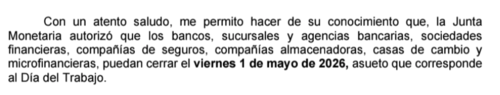 La Superintendencia de Bancos (SIB) informó que la Junta Monetaria autorizó a los bancos, sucursales y agencias bancarias, sociedades financieras, compañías de seguros, compañías almacenadoras, casas de cambio y microfinancieras, cerrar este próximo viernes 1 de mayo, Día del Trabajo.