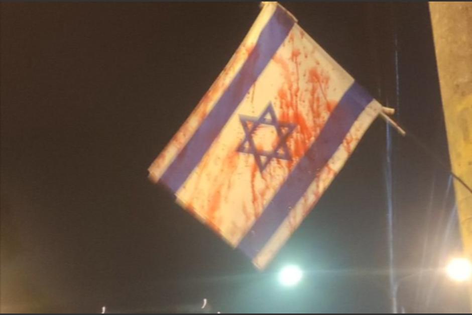 Con pintura roja, esta madrugada así mostraron su rechazo activistas a las banderas de Israel colocadas en zona 13 y 10. Circulan videos y fotografías en grupos y redes sociales .