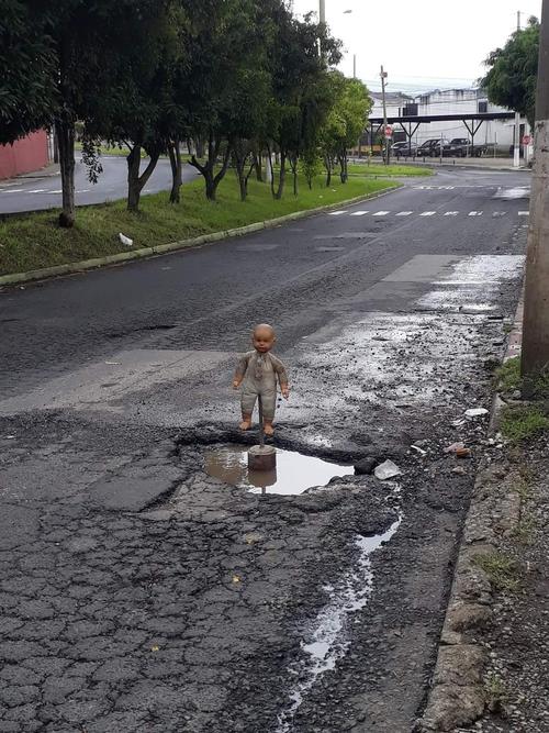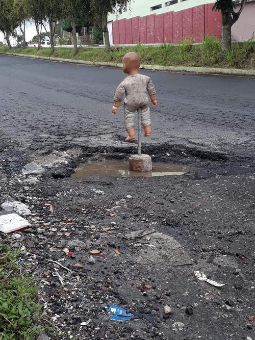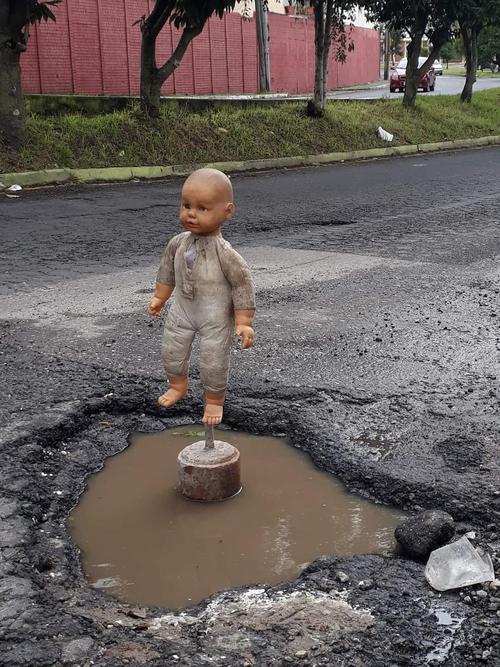 ¡Con un bebé de juguete! Esta es la peculiar forma en la que los vecinos del bulevar Tulam Tzu, zona 4 de Mixco, anuncian el peligro de un bache en el sector.
