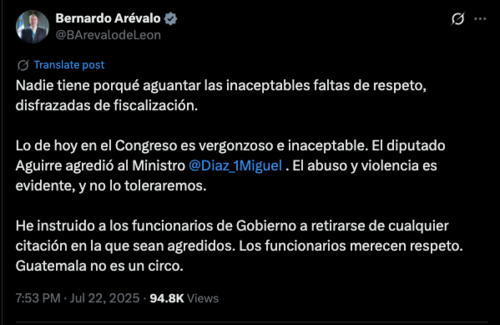 "Nadie tiene porqué aguantar las inaceptables faltas de respeto, disfrazadas de fiscalización. Lo de hoy en el Congreso es vergonzoso e inaceptable. El diputado Aguirre agredió al Ministro Miguel Ángel Díaz. El abuso y violencia es evidente, y no lo toleraremos. He instruido a los funcionarios de Gobierno a retirarse de cualquier citación en la que sean agredidos. Los funcionarios merecen respeto. Guatemala no es un circo." expresó el mandatario.