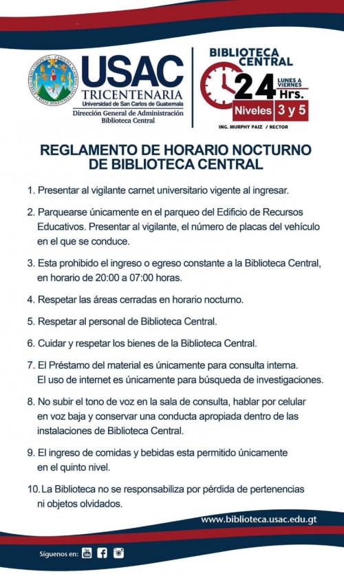 El material a consultar solo se podrá utilizar en el recinto y el consumo de alimentos está permitido únicamente en el área del quinto nivel.