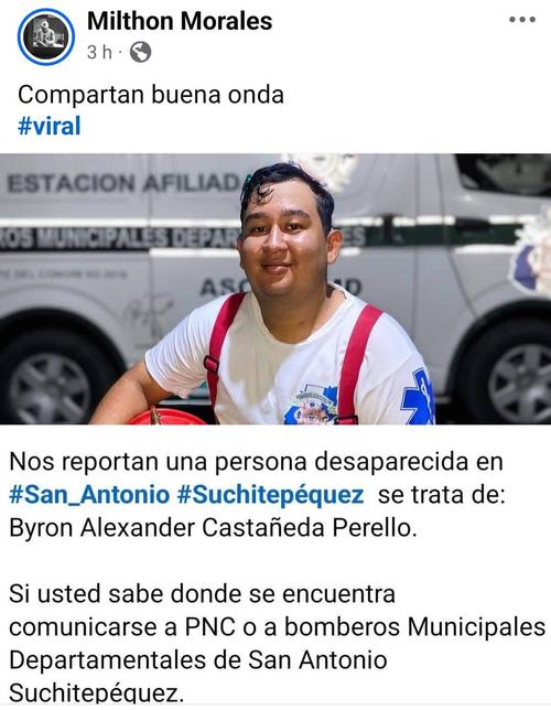 El secuestro del Bombero Municipal Byron Alexander Castañeda Perelló de 20 años ocurrió la noche del 1 de mayo en la colonia Las Victorias de Antonio Suchitepéquez, departamento de Mazatenango.