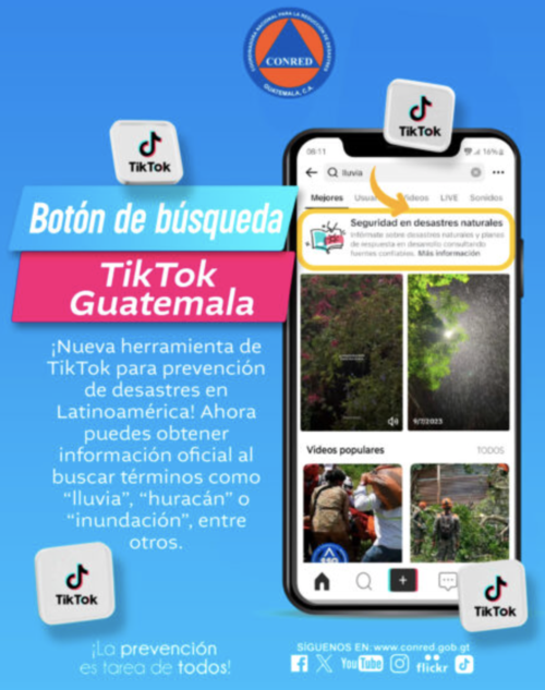 La institución indica que mediante dicha coordinación con TikTok, "se continúa con el esfuerzo interinstitucional para fortalecer la cultura de prevención, resiliencia y prevención de desastres, en beneficio de la población guatemalteca".