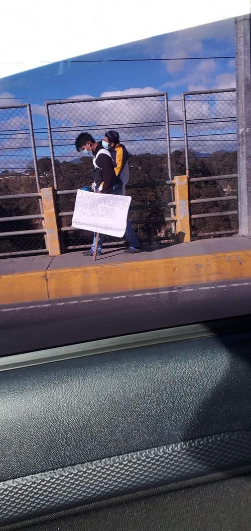 En redes sociales circulan imágenes de un joven que se encuentra en búsqueda de trabajo, con una cartulina blanca, en el Puente El Incienso.