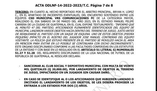 La Liga Nacional impuso una multa de Q20 mil a la entidad roja por este incidente, donde José Manuel Contreras, capitán de Comunicaciones, sufrió una herida en la cabeza al inicio del segundo tiempo.