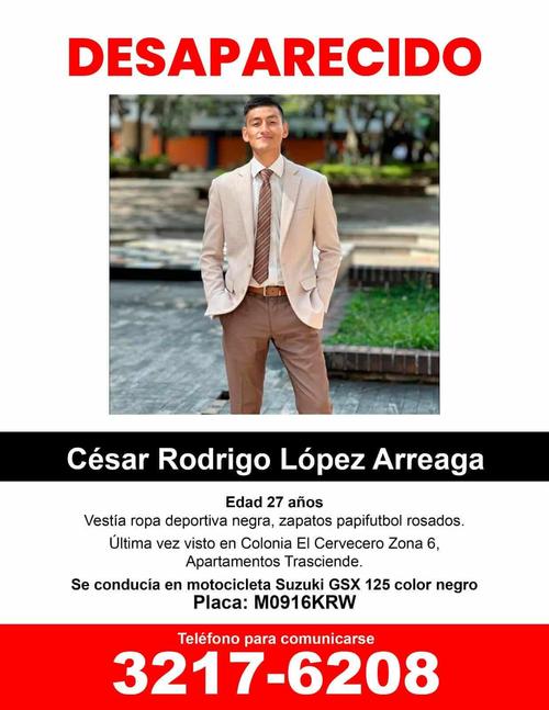 De acuerdo con la alerta que circula en redes sociales, se trata de César Rodrigo López Arreaga de 27 años, quien fue visto por última vez en la colonia El Cervecero.